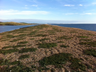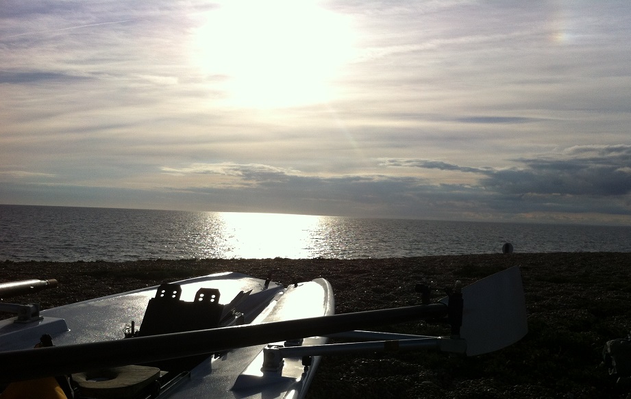 After a short rest, we carried all three boats over the beach to row the last part of the day on The Fleet, a lagoon that runs eight miles along behind Chesil Beach. The rest of the day remains in my mind a beautiful blur of the bright afternoon sun hanging low over Chesil Beach; the flatness of The Fleet compared to the sea on the other side; darkness creeping in; dark banks looming on either side; the strength of the tide flooding in and the ache of my muscles as we rowed against it; Portland Harbour, black and wide, with its tantalising lights twinkling across the flat water.