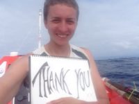 Today I went for a swim. It’s been a really hot, sunny day, and I thought I’d best make the most of this small window of weather that is calm enough. Although I love swimming and am usually one of the first to leap into icy lakes and stormy seas, it did take me a little time to work up to leaving the relative safety of Darien’s deck to plunge into the deep blue. I had a good look around for fins and for anything else that might have made for a less enjoyable swim, and took courage from the little fish that still swarm about – if there was nothing to worry them I guessed I’d be fine. I made sure I was attached to my lifeline land slid into the water. It was cool and clear, but what struck me most was how strange it was to be looking up at Darien, lying empty without me. As far as I could see in every direction, the only things visible on the surface of the water were me and Darien, and it felt quite uncomfortable to be separated from each other with nothing else around and the seemingly endless depths beneath.